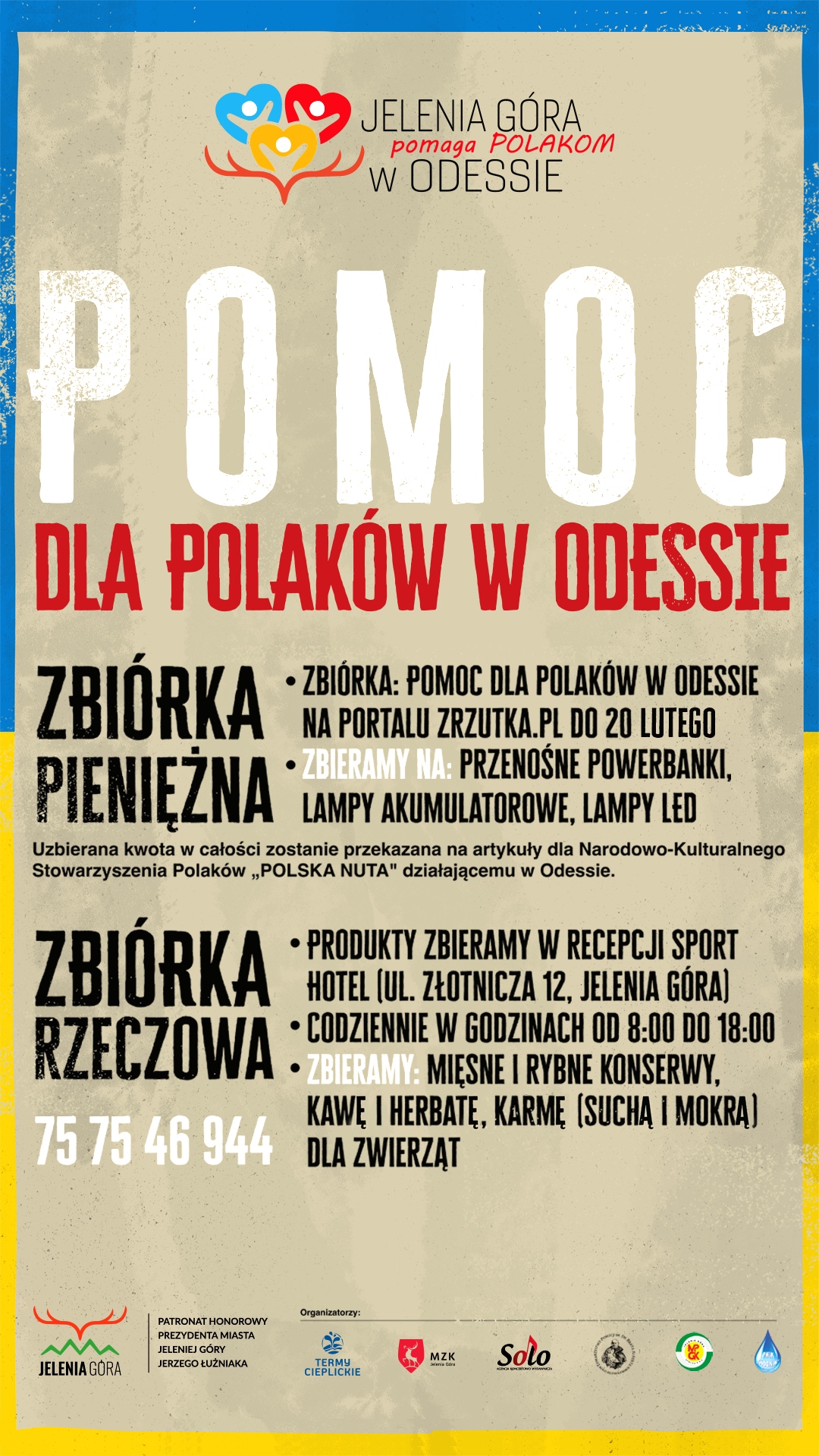 Odpowiadając na apel o pomoc przesłany przez Narodowo-Kulturalne Stowarzyszenie Polaków „POLSKA NUTA”, mając na względzie poprawę warunków życia obywateli Polski zamieszkujących Odesse, wyrażając z nimi głęboką solidarność, chcemy okazać naszym Rodakom swoje wsparcie poprzez organizację i zbiórkę najpotrzebniejszych rzeczy w postaci sprzętu.